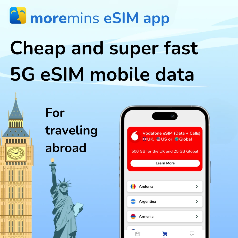 MoreMins offers eSIM mobile data of more than 150 countries + Vodafone Global eSIM + O2 European eSIM.