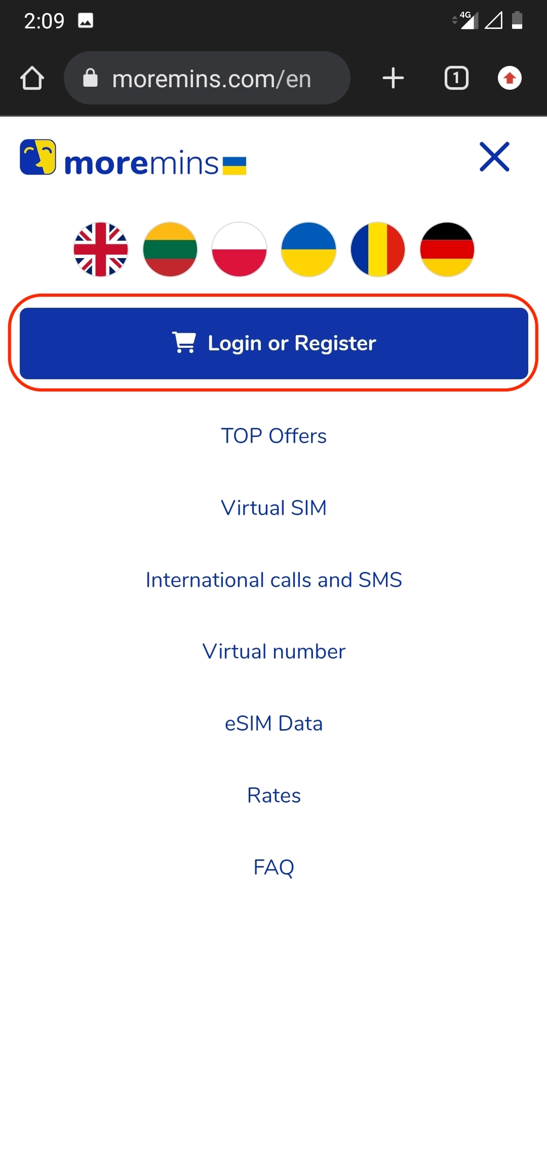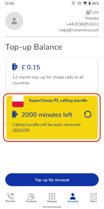 3. Click the button “Account“ if you want to login to your MoreMins account. Check your balance, details and top-up your MoreMins account here.