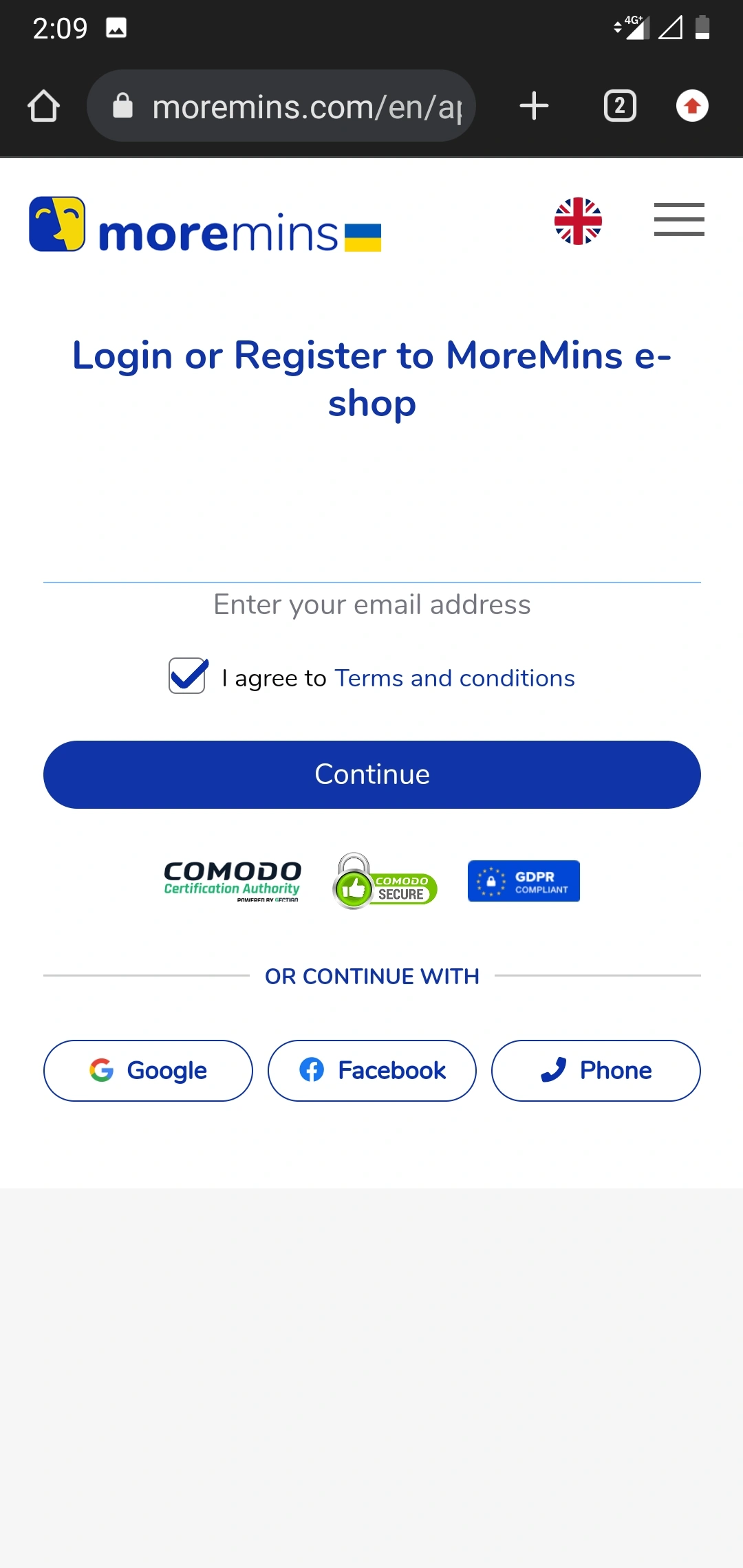 2. You will be redirected to the log in page. Here you will need to enter your MoreMins accounts email address or phone number. Please make sure you are entering the correct details, as you will create a new account if you enter a different email or phone number.