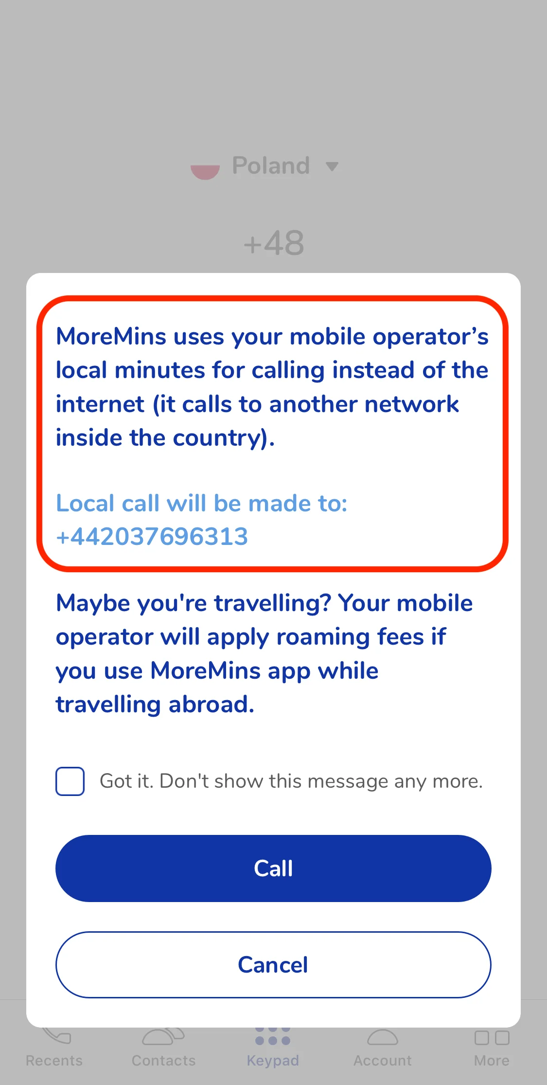 In most cases, it is better not to call via MoreMins app without the internet when you travel outside your home network. Or, to put it simply, when you use your phone abroad.