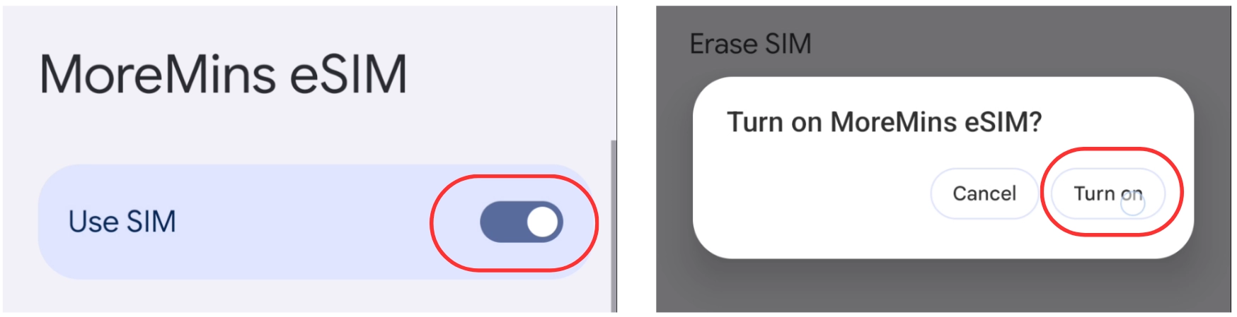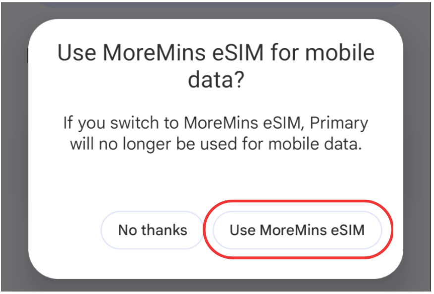 6. In the window "Use MoreMins eSIM for mobile data?" click on "Use MoreMins eSIM".