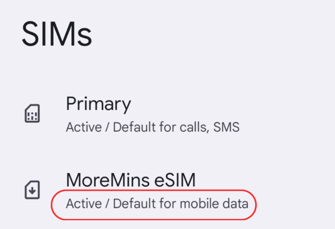 Turn off Wi-Fi. Your smartphone's data setting Settings > Network & Internet > Internet should show MoreMins eSIM - Connected / 4G (or 5G, LTE symbol).