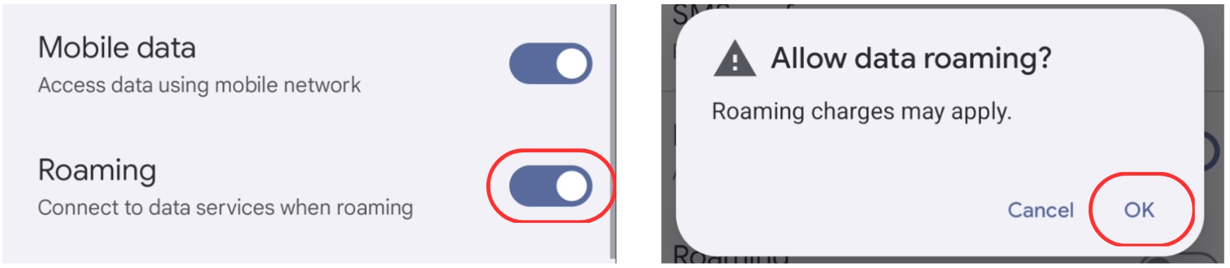 8. In the MoreMins eSIM settings window, turn on the Roaming setting and click OK.