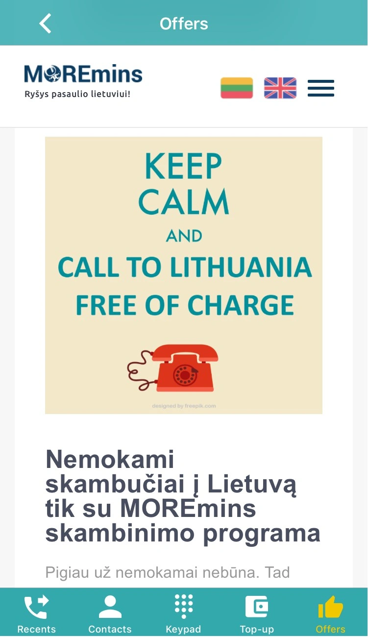 Šiame naujame skyriuje rasite MOREmins pigių tarptautinių pokalbių planų aprašymus ir net kelis būdus, kaip gauti kreditų skambinti į Lietuvą ir į kitas užsienio šalis visiškai nemokamai!