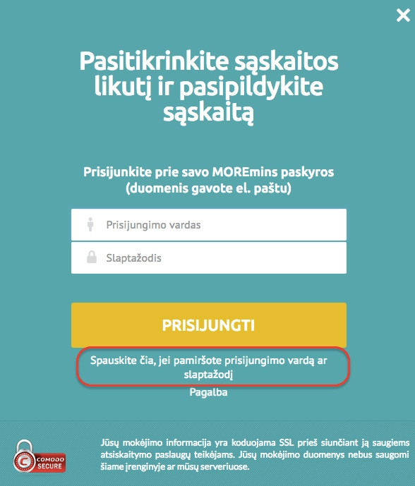 Nuotraukoje apačioje raudonai pažymėjome mygtuką, kurį paspaudę, galite atsisiųsti prisijungimo duomenis į savo el. pašto dėžutę.