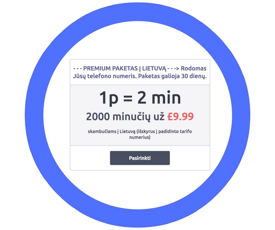 Premium planą galima gauti dviem būdais. Jeigu pildotės sąskaitą 12 mėnesių, tuomet galime specialiai Jums įjungti šiek tiek brangesnį tarifą į Lietuvą – 3 p/min ar 4,1 euro ct/min. Parašykite mums į [email protected].