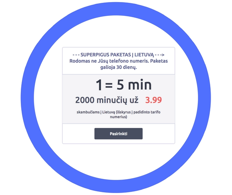 Populiariausias tarp užsienyje gyvenančių lietuvių – Superpigus 2000 minučių paketas, skirtas skambučiams į Lietuvą. Šis mėnesį galiojantis paketas kainuoja 3.99.