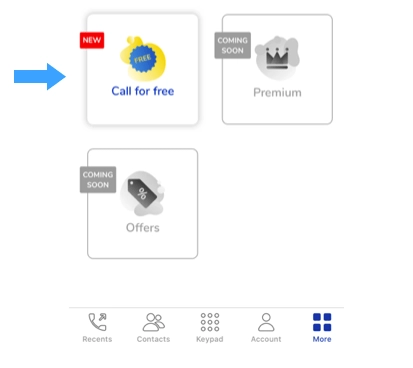 1. ВІДКРИЙТЕ мобільний додаток MoreMins. Перейдіть до розділу меню «MORE» і виберіть «Телефонувати безкоштовно».