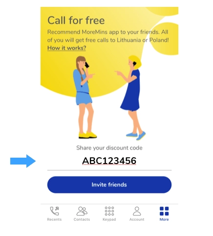 2. ПОДІЛІТЬСЯ КОДОМ зі своїми друзями і родичами, які ще не користуються додатком MoreMins. Код є дійсним тільки для нових користувачів.
