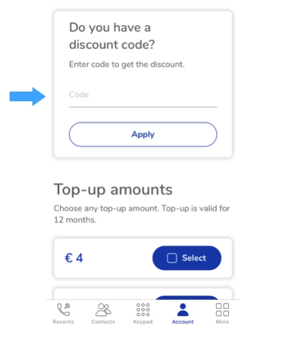 3. НОВИЙ КОРИСТУВАЧ повинен скачати додаток MoreMins і зареєструватися в ньому. Потім він або вона повинен перейти в: Рахунок/Поповнити мій рахунок/У вас є код на знижку?