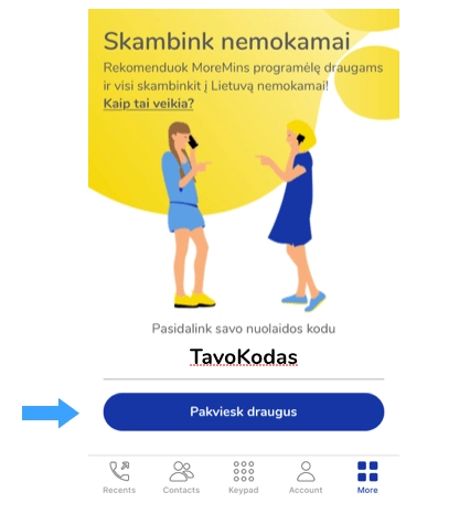 2. PASIDALINK KODU su draugais ar artimaisiais, kurie dar nesinaudoja MoreMins programėle. Kodas galioja tik naujiems vartotojams.