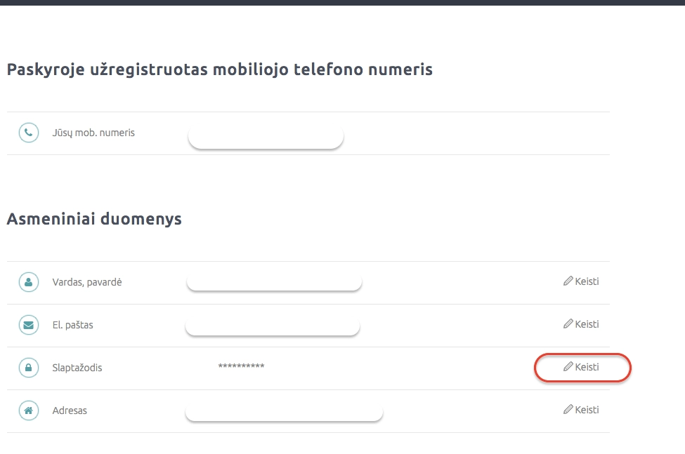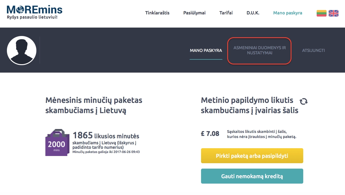 Tereikia prisijungti prie MOREmins paskyros ir nueiti į skiltį “Asmeniniai duomenys ir nustatymai”.