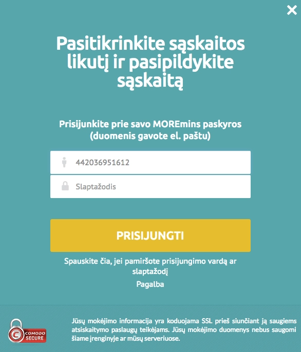 Prisijungimo vardas yra Jūsų telefono numeris su šalies kodu priekyje (tik nereikia vesti 00 ar +).