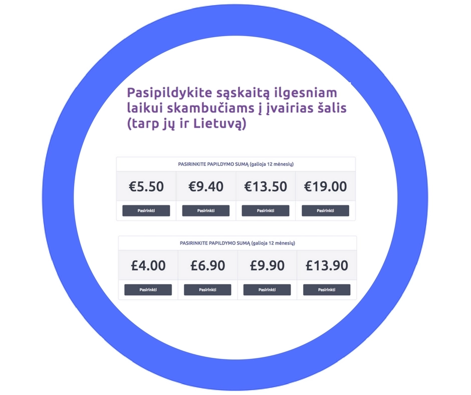 Tokiu atveju minutės kaina į Lietuvą – visada 1 p/min skambinant iš Jungtinės Karalystės ir 1 euro ct/min skambinant iš kitų Europos šalių.