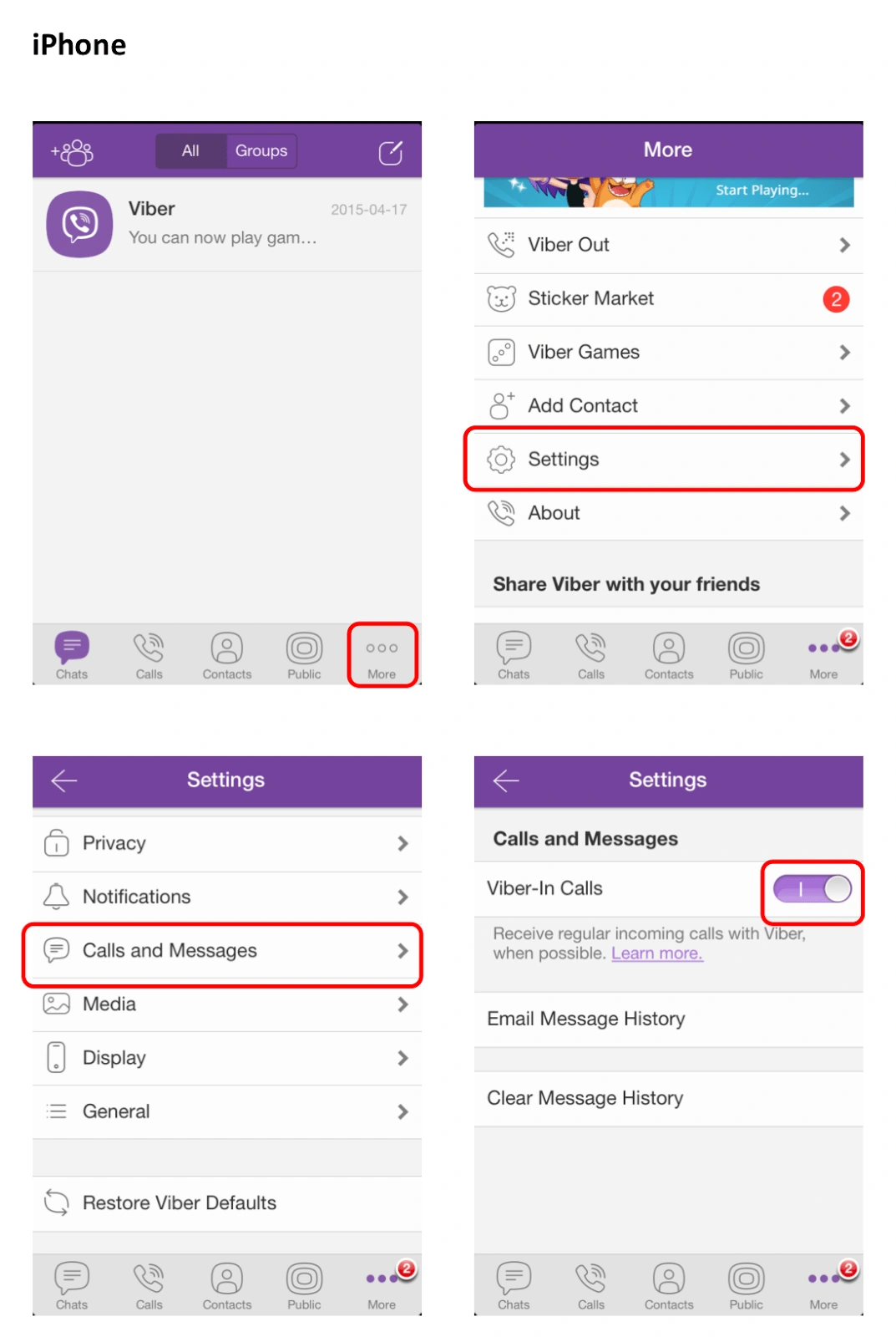 More (символ меню)/ Налаштування/ Дзвінки та повідомлення/ Viber-In Calls