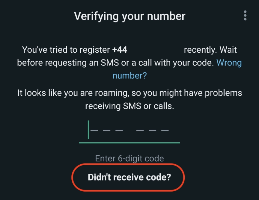 Якщо ви не отримуєте SMS від WhatsApp на сторінці реєстрації, спочатку спробуйте натиснути кнопку "Не отримали код?", а потім "Повторно надіслати SMS".