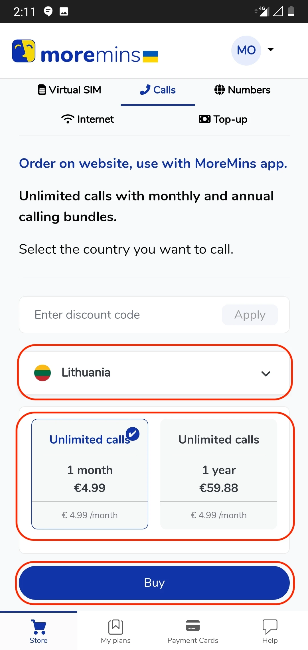 3. Після успішного входу ви потрапите в магазин MoreMins. Наступним кроком буде вибір категорії товару, який ви бажаєте придбати. Зараз також вдалий час, щоб застосувати будь-які коди знижок, які у вас можуть бути. Ви будете отримувати інформацію про наші акції в додатку MoreMins або електронною поштою, тож слідкуйте за ними! Після застосування коду ви побачите оновлені ціни.