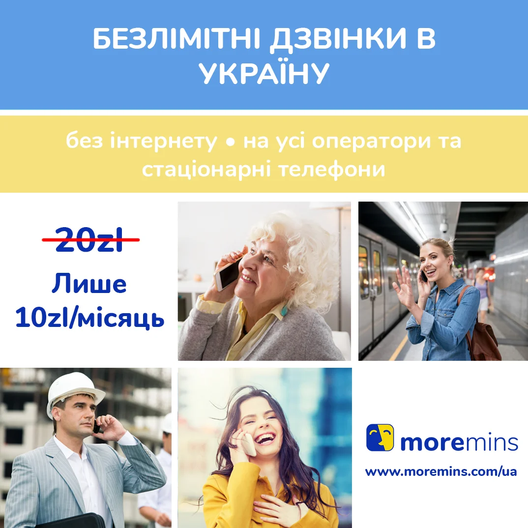 Будь завжди поруч з друзями та рідними в Україні. Встанови мобільний додаток MoreMins та отримай безлімітні хвилини на цілий місяць усього за 10 злотих!