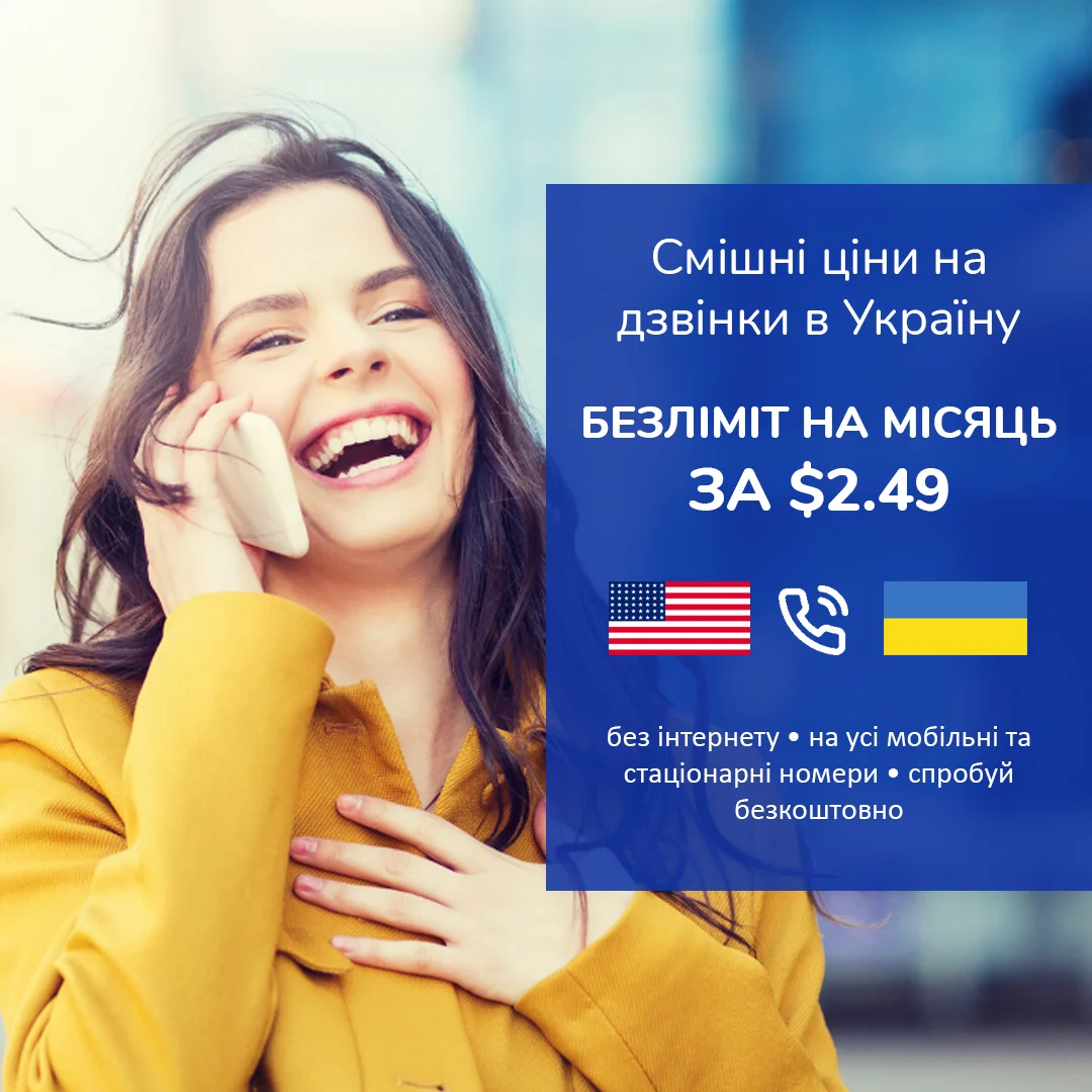 Не переплачуй за розмови з близькими! Телефонуй з CША на усі українські номери та спілкуйся безлімітно. Встановлюй додаток безкоштовно та користуйся спеціальної пропозицією: місяць безліміту за $2.49.