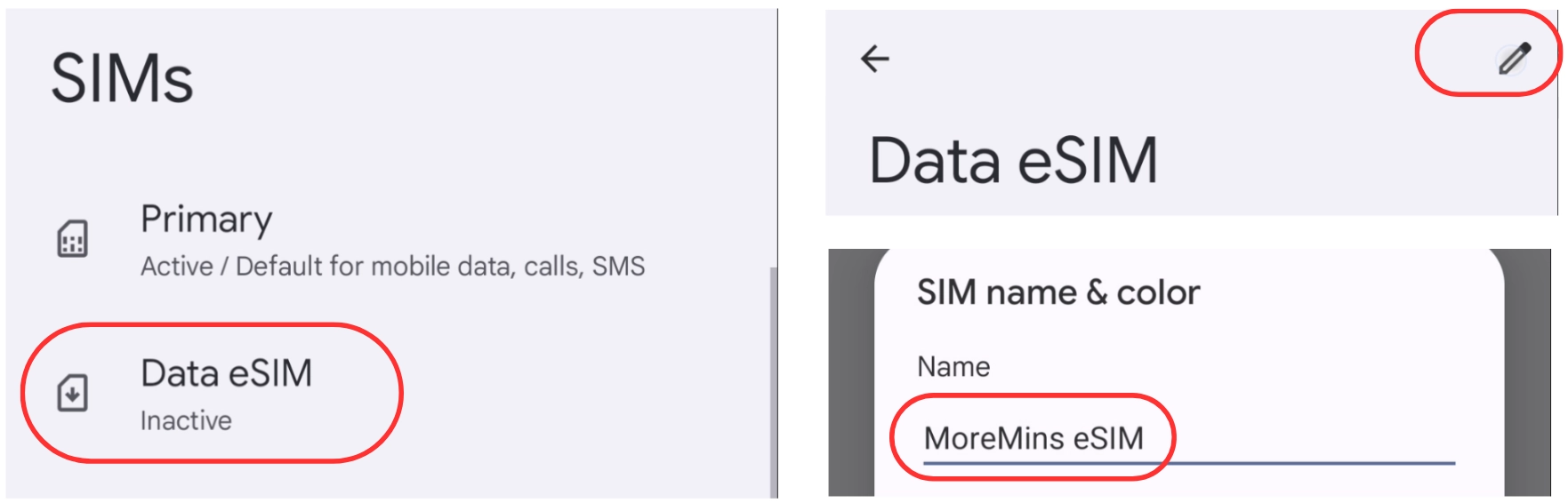 4. Відкрийте "Data eSIM" і натисніть на символ олівця у верхньому правому куті. Перейменуйте встановлену eSIM на - "MoreMins eSIM". Її буде легше знайти пізніше.