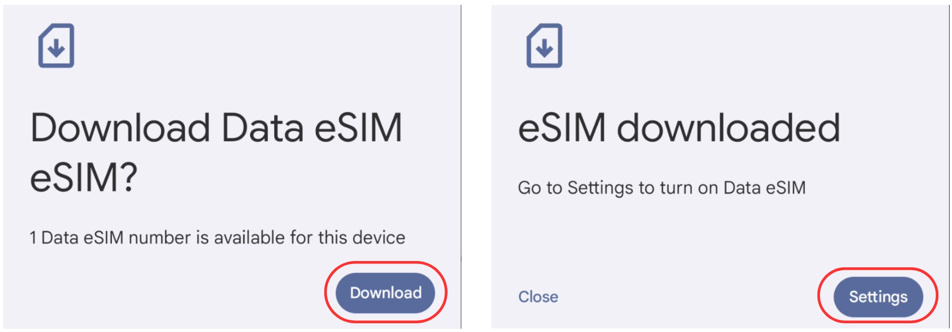 3. Натисніть "Завантажити" у вікні "Завантажити дані eSIM?" та "Налаштування" у вікні "eSIM завантажено".