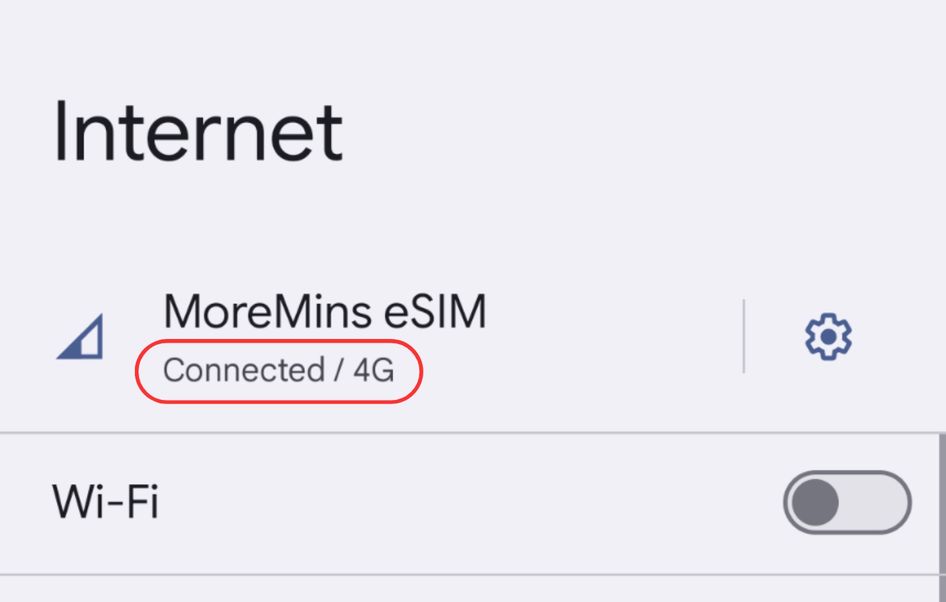 Вимкніть інтернет через Wi-Fi. У налаштуваннях інтернету вашого телефону в розділі " Settings > Network & Internet > Internet" має відображатися MoreMins eSIM - Connected / 4G (або символ 5G, LTE).